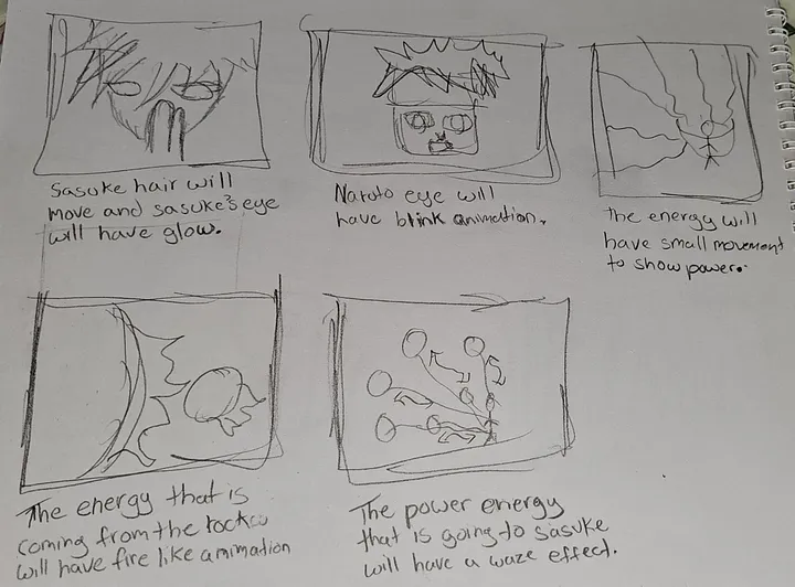 First, I made a storyboard that helped me with what I wanted to do. Having a good idea of how the animation will play out helps me because having the animation planned out beforehand makes it easy when doing the animation. I do not have to guess or think about it because I have it planned out.